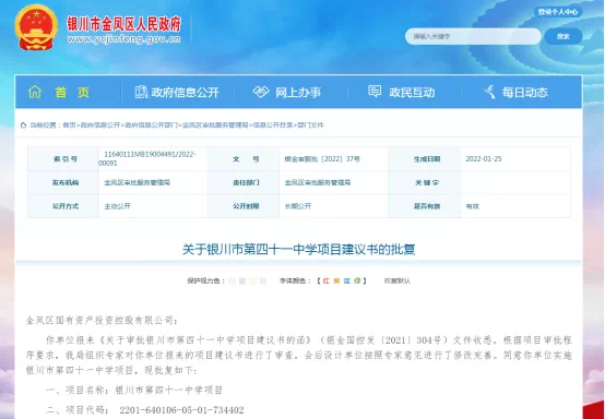 近日,银川市金凤区人民政府公布了关于银川市第四十一中学项目建议书的批复公示