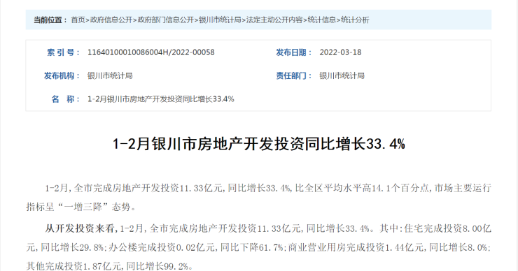 与此同时,银川统计局也发布了一组数据,1-2月银川房地产开发投资同比增长33.4%!
