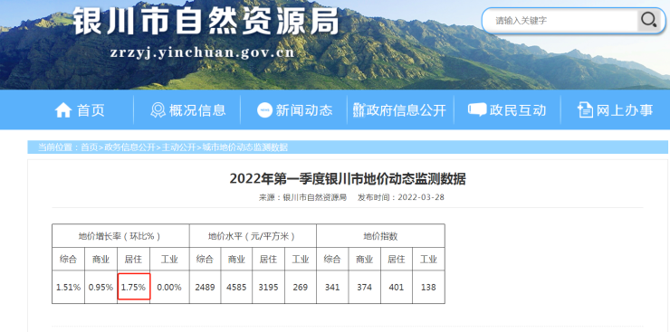近日,银川自然资源局也发布了2022年排名前列季度银川市地价动态监测数据,其中住宅地价环比增长1.75%。地价水平比2021年第四季度增长了45元/㎡。