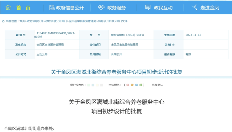 11月13日,金凤区审批服务管理局发布了《关于金凤区满城北街综合养老服务中心项目初步设计的批复》。