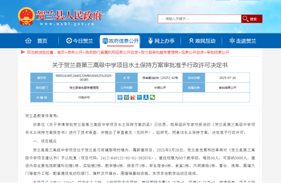 近日,贺兰县人民政府网发布关于《贺兰县第三高级中学项目水土保持方案审批准予行政许可决定书》,该项目总投资40122万元,建设规模为60个教学班,计划2025年7月开工,于2027年8月完工,总工期为26个月。