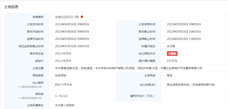 据宁夏公共资源交易网发布的公告信息显示,永地(G)[2022]-3号地块的出让限制方式并未限制,即该地块不做地块出让较高限价,也不做房屋销售限价。