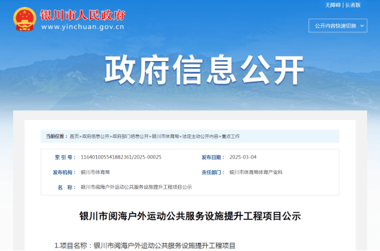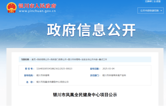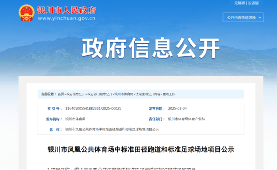 近日,银川市体育局发布关于《银川市凤凰全民健身中心》、《银川市凤凰公共体育场中标准田径跑道和标准足球场地》、《银川市阅海户外运动公共服务设施提升工程》3个项目公示,具体详情如下: