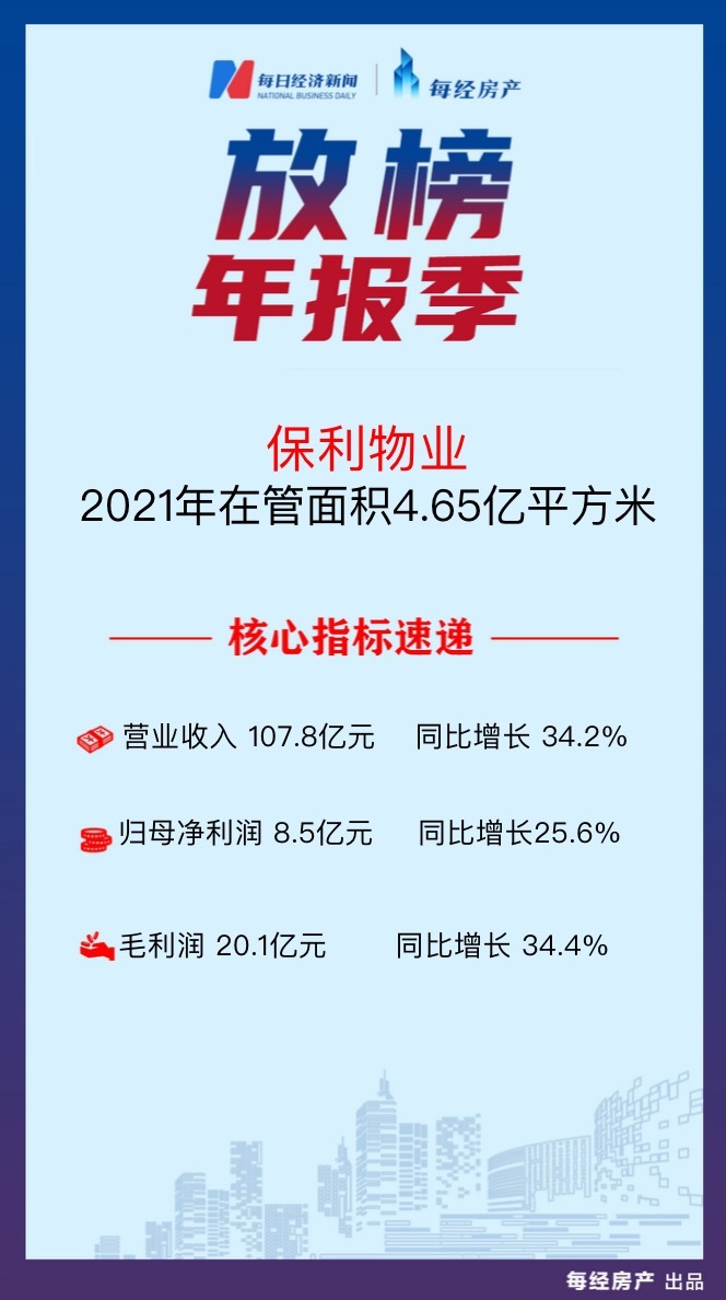 年报数据显示,2021年保利物业营收107.8亿元,同比提升34.2%;毛利达20.1亿元,同比上升34.4%;归母净利润8.5亿元,同比上升25.6%。这是其总收入首次突破百亿元。