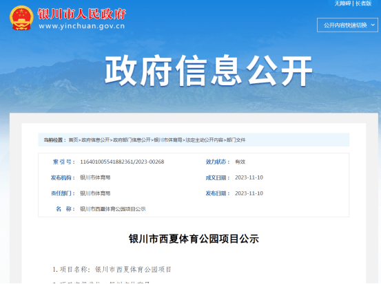近日,银川人民政府网发布关于新建银川市西夏体育公园项目公示,总投资4500万元。具体详情如下: