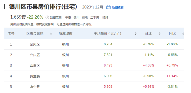 三区两县排名为:金凤区(8734元/㎡)>(兴庆区7321元/㎡)>西夏区(6493元/㎡)>贺兰县(6006元/㎡)>永宁县(5309元/㎡)
