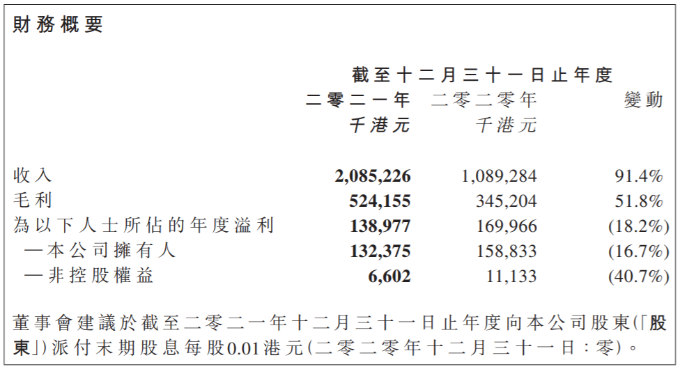另一家同样从事装配式建筑的头部企业筑友智造科技集团有限公司(00726.HK,以下简称筑友智造科技)的2021年报显示,期内实现营收20.85亿港元,同比增长91.4%;毛利润5.24亿港元,同比增长51.8%。而毛利率和股东应占溢利均同比出现明显下滑。