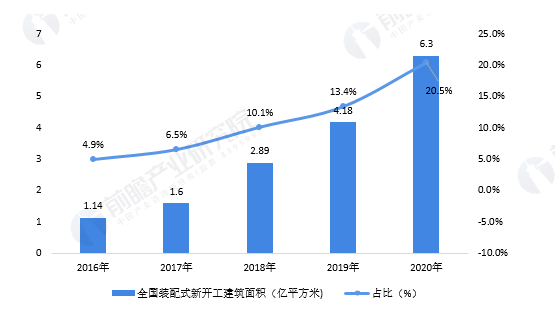 2016-2020年我国装配式建筑新开工建筑面积及占比情况 来源:前瞻产业研究院