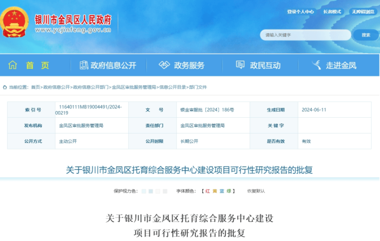 近日,银川市金凤区人民政府网发布了《关于银川市金凤区托育综合服务中心建设项目可行性研究报告的批复》信息。将在金凤区庆丰街东侧,黄河路北侧、祥安巷南侧之间的地块上新建托育综合服务中心,占地面积9711平方米,总投资估算为1500万元。