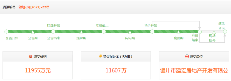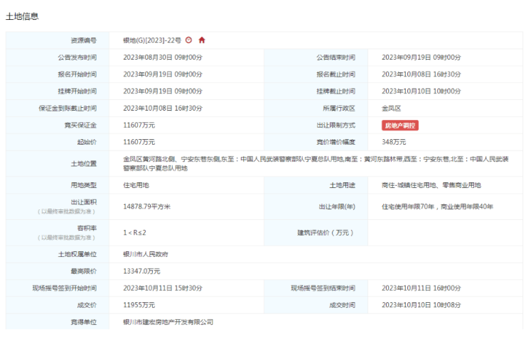 金凤区22号地经过2家房企争夺,2轮报价,被银川市建宏房地产开发有限公司以总价11955万元摘得。