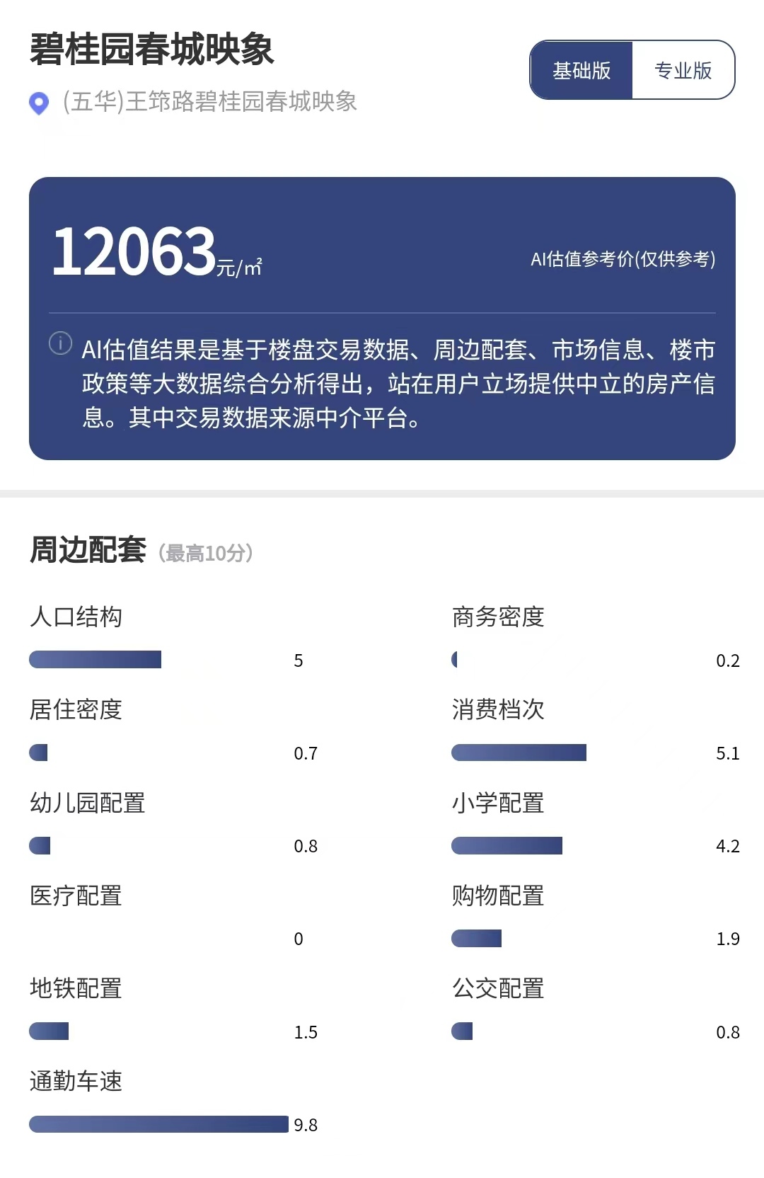 不过,该项目周边的医疗配套、商务密度、地铁和公交配置的得分均较低。每经品房小程序基于以上各维度测算,未来五年碧桂园春城映象的房价涨幅可能会跑输五华区平均水平,会跑平全国平均涨幅,高于全国86%的区县。