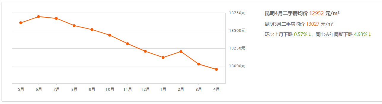 值得注意的是,自去年下半年以来,昆明房地产市场处于持续下行趋势。安居客数据显示,去年6月昆明新房均价为13699元/平方米,而今年4月份为12952 元/平方米,每平方米跌超700元。国家统计局较新数据显示,3月昆明新房价格环比下降0.3%,同比下降1.9%;二手房价格环比上涨0.4%,同比下降0.5%。