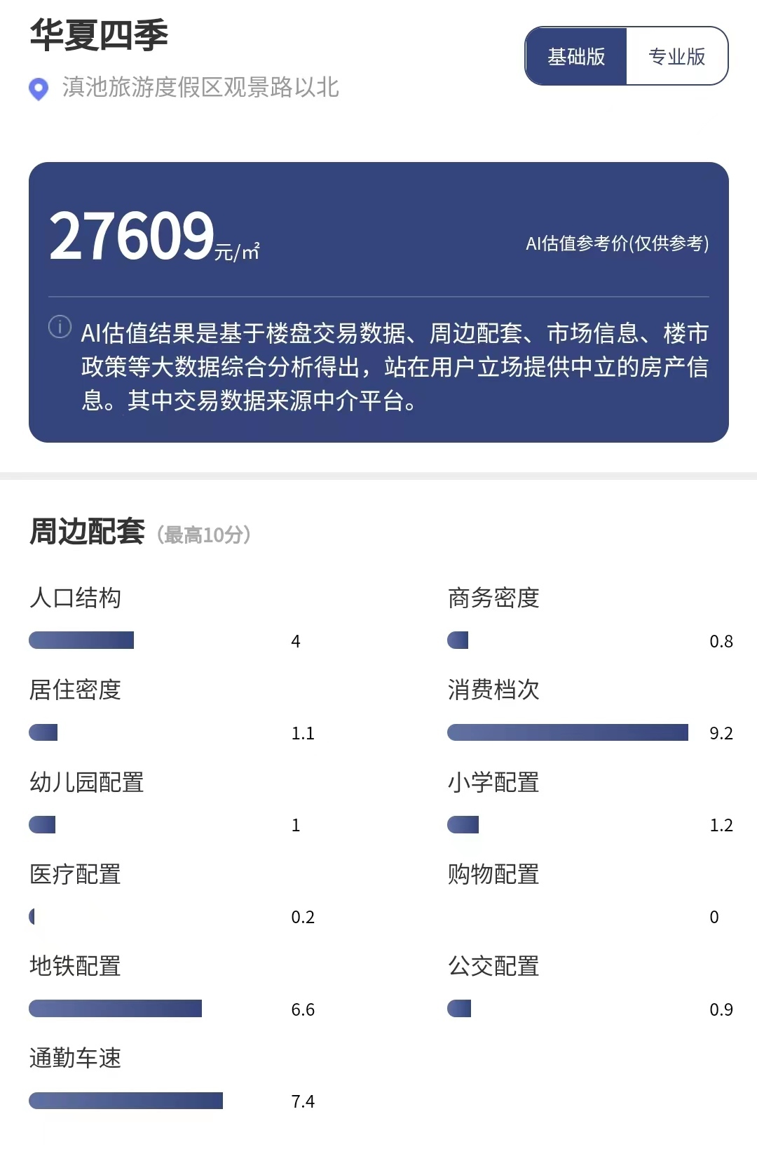 在通勤车速方面,华夏四季周边1公里(直线距离)主要道路早晚高峰平均车速为20.13公里/小时,优于西山区74%的住宅项目,属于驾车出行舒适度中的区域。