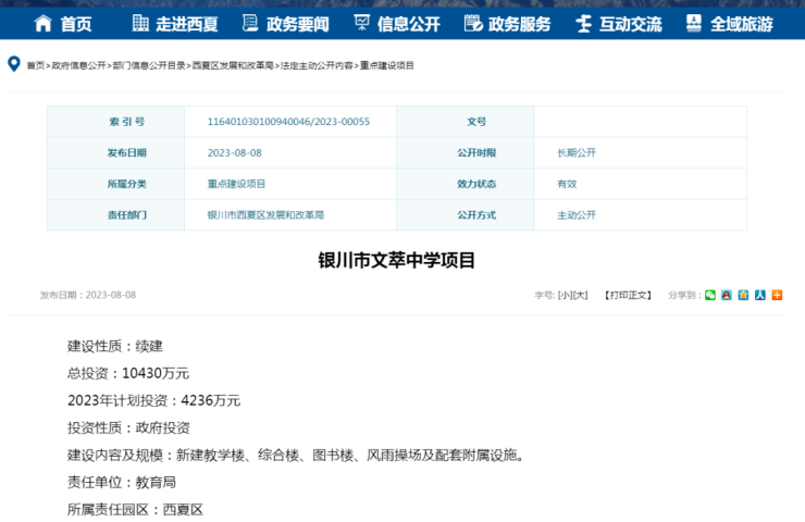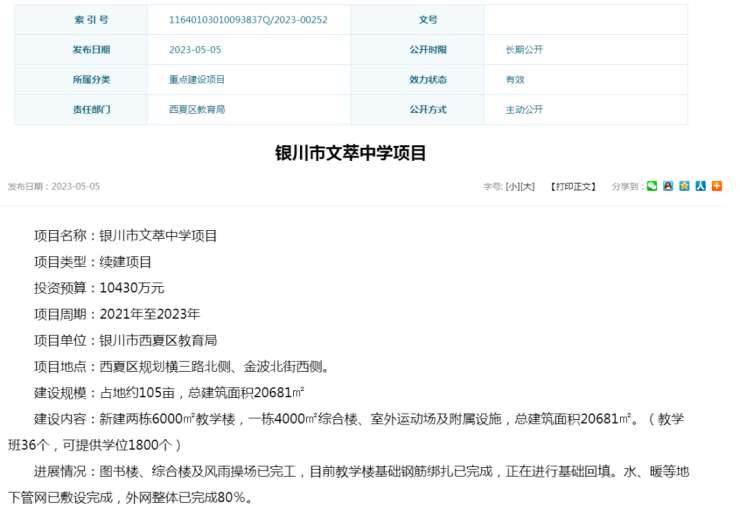 近日,银川市政府网站公示了银川市文萃中学项目续建方案,总投资10430万元,2023年计划投资4236万元。