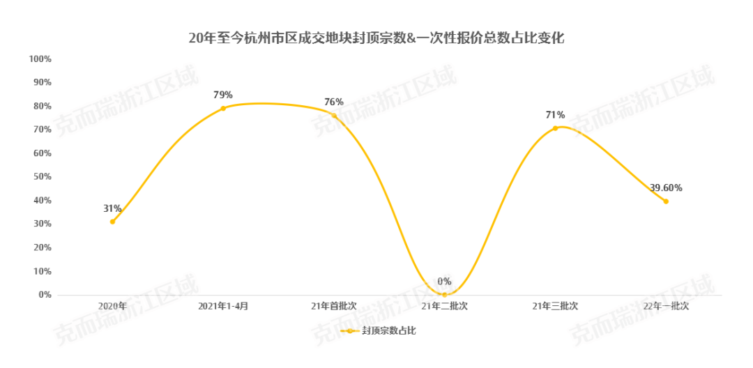 如果从从溢价率来看,本次杭州的土拍结果很难用“热”来总结。据克而瑞统计,本次杭州土拍共有23宗地块溢价封顶,并进入一次性报价环节,“封顶率”约40%,和去年三批次的71%相比热度明显下滑,回归至2020年的土拍市场水平。同时,本次共有25宗地块底价成交,并出现了自杭州集中供地以来首宗流摇地块。
