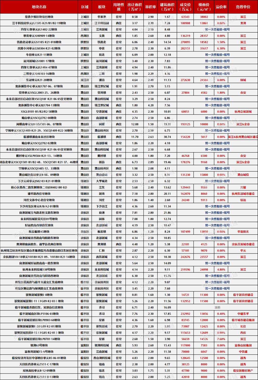 “本次土拍热度分化明显,总共60宗地块除2宗人才租赁用地外,剩余的58宗宅地中有1宗流摇,该地块周边邻近高架、厂房等,微环境欠佳。25宗底价成交的地块,所在区域多为临安、富阳以及萧山郊区等去化能力相对偏弱区域。远郊地块及外部乡镇的地块则多由城投公司竞得,包括临平城建集团、临平新农村建设、萧山城建等。”