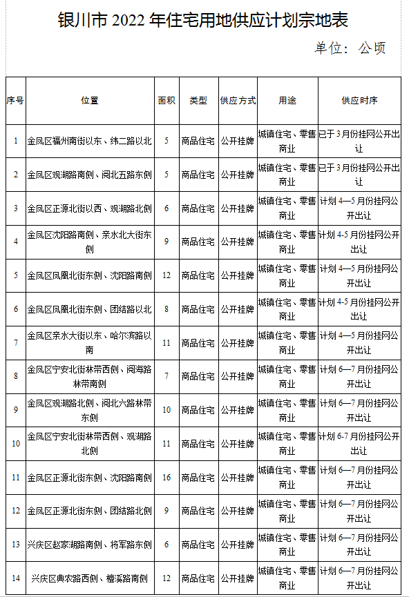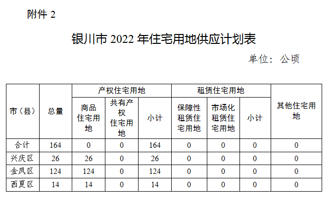 根据现行银川市土地利用总体规划、银川市城市总体规划、中心城区各片区控制性详细规划等上位规划,经梳理,四环以内我市可用出让商住用地约164公顷。2022年拟出让商住用地22宗约164公顷,其中金凤区商住用地124公顷,兴庆区商住用地26公顷,西夏区14公顷 ,保障性住房(经济适用住房、公共租赁住房、保障性租赁住房等)无新建计划。