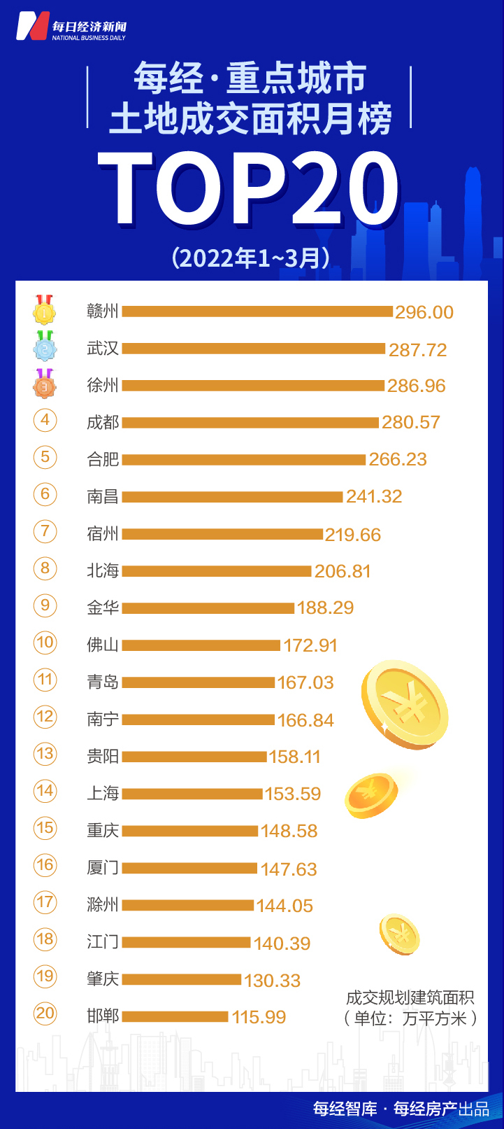 其中,赣州以成交规划建筑面积296万平方米位居排名前列,武汉、徐州分别为287.72万平方米和286.96平方米,其余城市之间差距微小。与2月不同的是,榜单所有城市土地成交均超过110万平方米,TOP20城市土地成交规划面积合计3919万平方米,超过2月合计面积的2倍多。