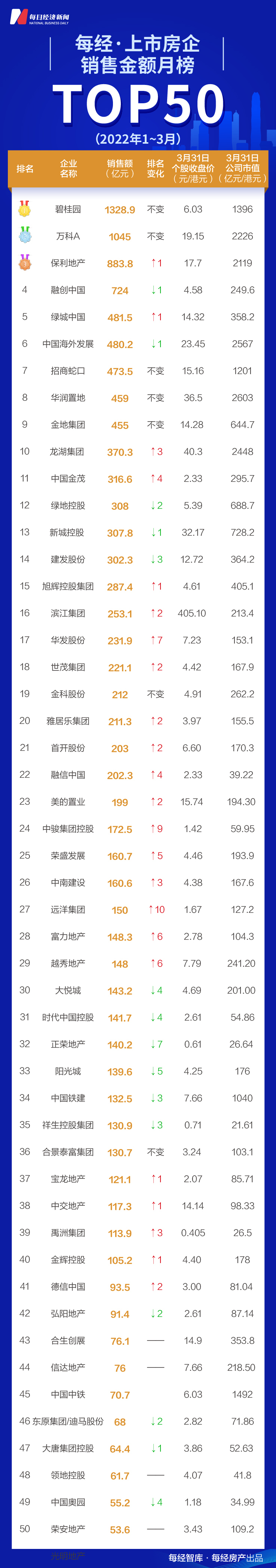 2022年1-3月,TOP50上市房企销售额合计1.3万亿元,3月单月销售业绩4793亿元,比2月单月(3313.8亿元)回升45%。