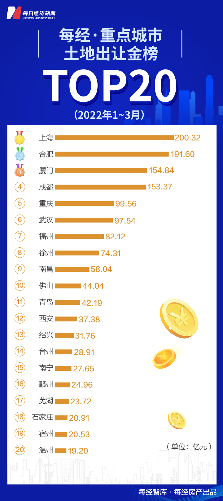 上海以200.32亿元稳居榜首,合肥2022年首次土地集中出让,其中15宗地达到较高限价后进入竞品质阶段,市场热情令合肥3月土地出让金仅次于上海,达到191.6亿元。