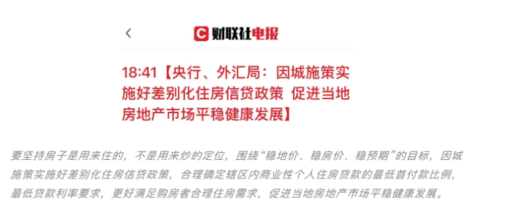 二、围绕“稳地价、稳房价、稳预期”目标,因城施策实施好差别化住房信贷政策,合理确定辖区内商业性个人住房贷款的较低首付款比例、较低贷款利率要求,更好满足购房者合理住房需求,促进当地房地产市场平稳健康发展。