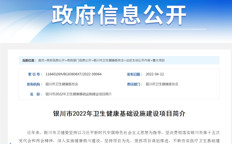 近日,银川市人民政府了发布《银川市2022年卫生健康基础建设项目简介》,文件指出,2022年,共实施卫生健康基础建设项目7个,计划投资约6.2亿元,年度计划投资2亿元。