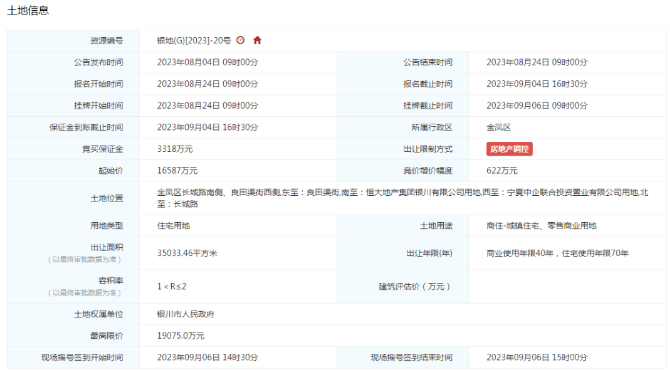 银地(G)[2023]-20号地块占地面积35033.46㎡(合52.55亩),地块起始总价为16587万元,起始楼面价为2367元/㎡。