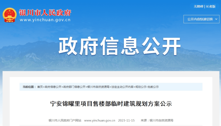 2023年11月15日,银川市自然资源局公示了宁安锦曜里项目售楼部临时建筑规划方案,公示时间为2023年11月15日至2023年11月23日。