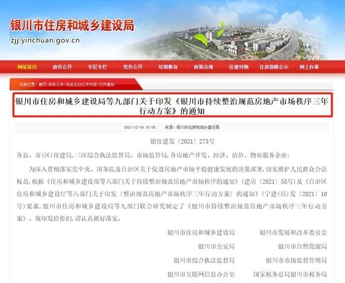 银川市住房和城乡建设局、银川市发展和改革委员会、银川市公安局、银川市自然资源局、银川市综合执法监督局、银川市市场监督管理局、银川市互联网信息办公室、国家税务总局银川市税务局、银川市金融工作局等九部门联合发文,制定《银川市持续整治规范房地产市场秩序三年行动方案》,主要从房地产开发、房屋买卖、住房租赁、物业服务、房地产估价、非法集资六个方面进行重点整治,力争用3年左右时间,房地产企业违法违规行为得到有效遏制,银川市房地产市场环境进一步有效净化。