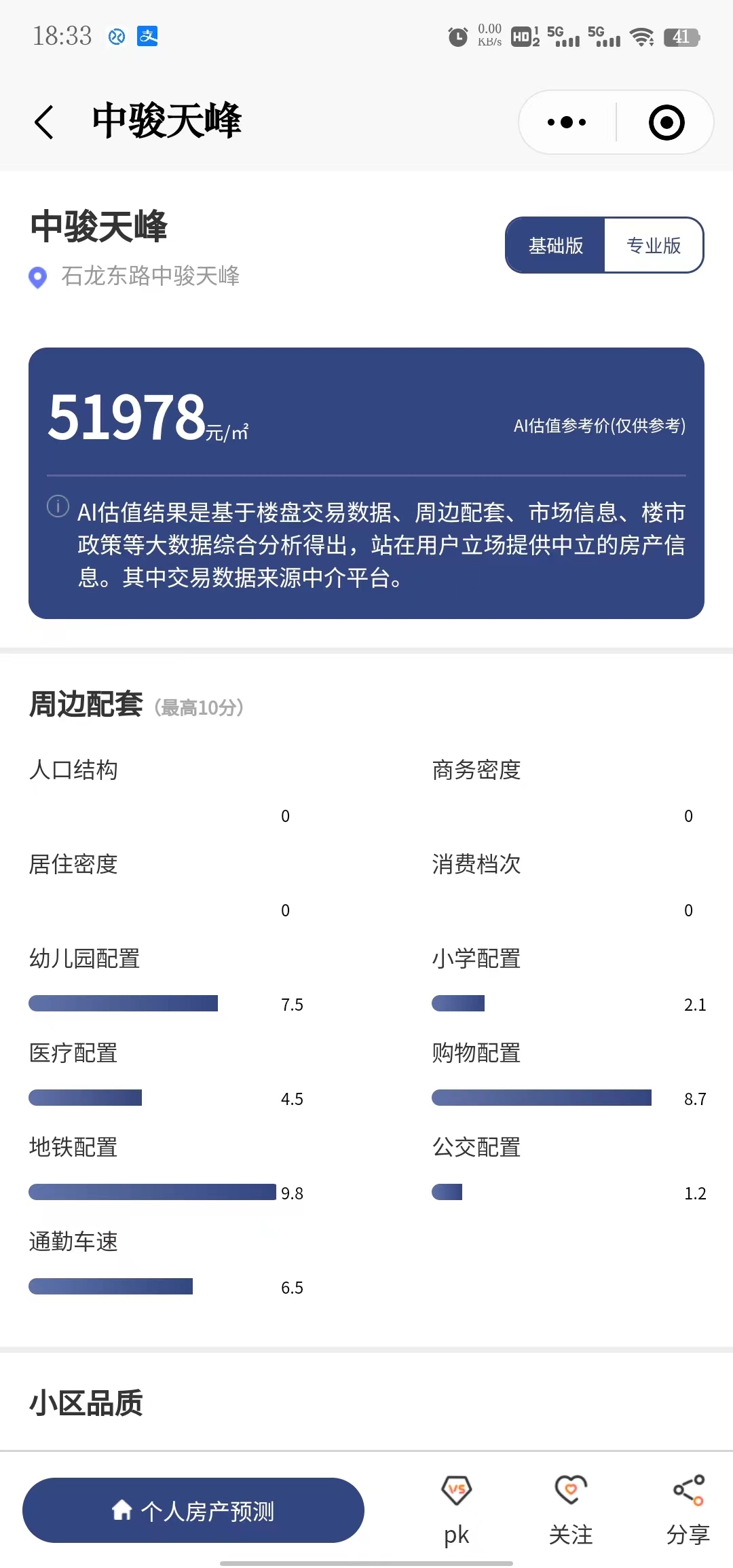 每经品房小程序显示,和峯范北京项目一站地铁之隔的中骏天峰项目的估值参考价为51978元/平方米,周边各项配套中,较高得分为地铁配置(9.8分)和购物配置(8.7分)。距离四道桥地铁站仅3公里左右的永兴小区(建于1996年),估值参考价仅为34531元/平方米。