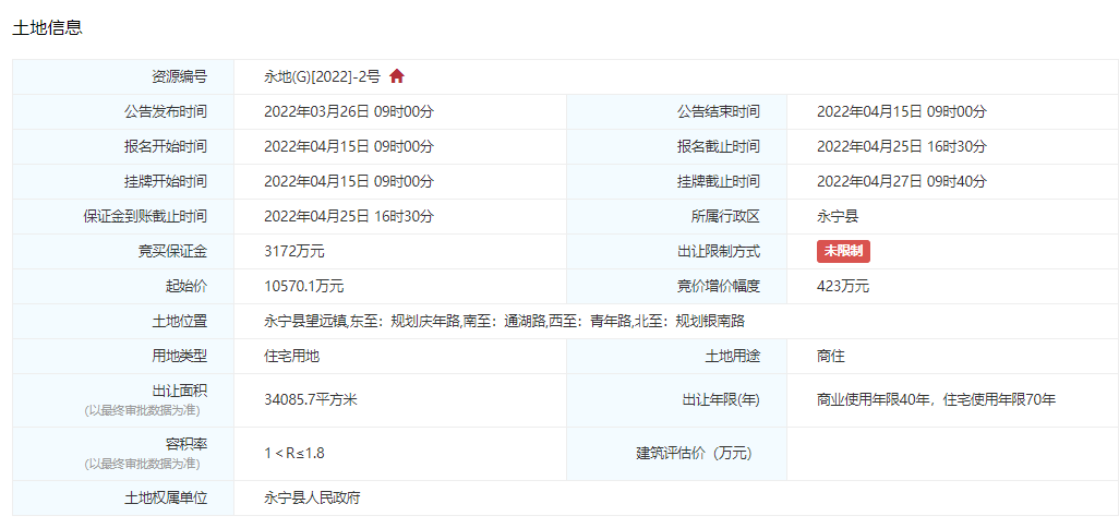 永地(G)[2022]-2号土地位置:永宁县望远镇土地面积:34085.70平方米(合51.13亩)土地用途:商住,居住用地为主,兼容商业用地比例5%-15%容积率:1<R≤1.8建筑密度:JM≤28%绿地率:L≥35%供地状况:净地出让年限:商业使用年限40年,住宅使用年限70年挂牌起始价:10570.10万元挂牌楼面地价:1723元/平方米