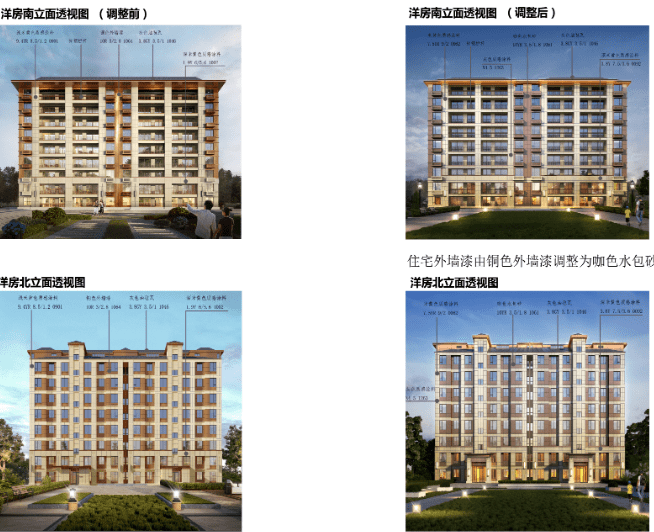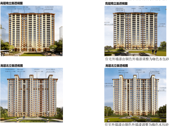 4、建筑立面材质由铜色外墙漆调整为咖色水包砂,米黄色色号微调,立面形式与原方案一致。