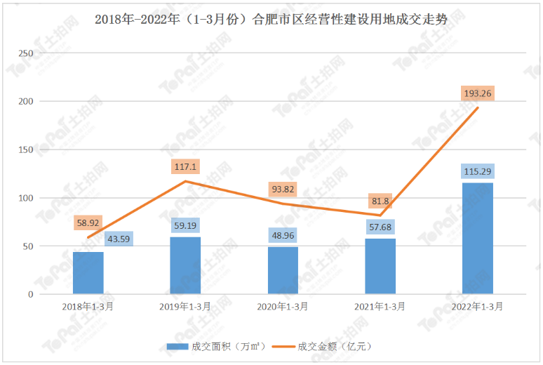 据土拍大数据显示,今年一季度合肥市区经营性建设用地共出让31宗,成交面积115.29万平方米,成交金额193.26亿元。同比去年分别上升约99.88%和136.23%,也达到近五年峰值。