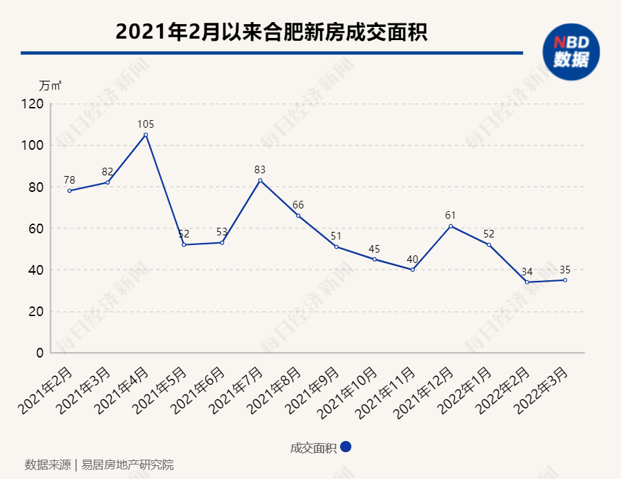 上海易居房地产研究院百城住宅库存报告显示,合肥月度成交面积在2021年1月冲高至105万平方米后开始回落,除4月份异动出现反弹外,其余月份维持在平均58万平方米左右。今年2月份单月成交34万平方米,同环比分别下降56%和35%,也是近24个月的成交较低点。