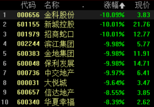 截至今日收盘,A股方面,金科股份、新城控股、招商蛇口、滨江集团、金地集团、保利发展、中交地产均跌停,大悦城跌幅为9.64%,万科A、信达地产和华夏幸福跌幅均超8%。