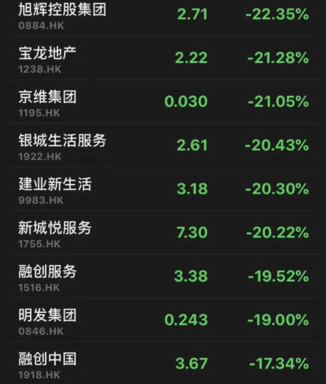 港股方面,旭辉控股的跌幅达22.35%,宝龙地产跌21.28%,融创中国跌17.34%,龙湖集团、正荣地产、中国恒大的跌幅均超15%,绿城中国、中骏集团的跌幅均超13%,中国金茂、时代中国、碧桂园、合生创展的跌幅均超10%。