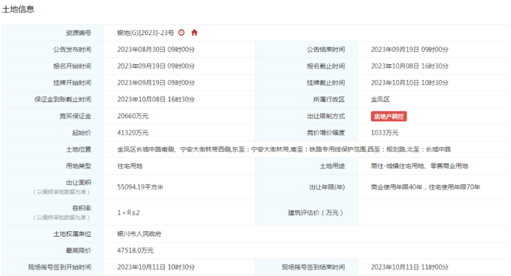 银地(G)[2023]-23号占地55094.19平方米(约合82.64亩),起拍总价41320万元,起始楼面价3750元/㎡。