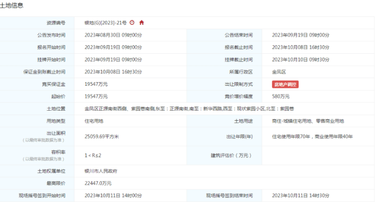 银地(G)[2023]-21号占地25059.69平方米(约合37.59亩),起拍总价19547万元,起始楼面价3900元/㎡。