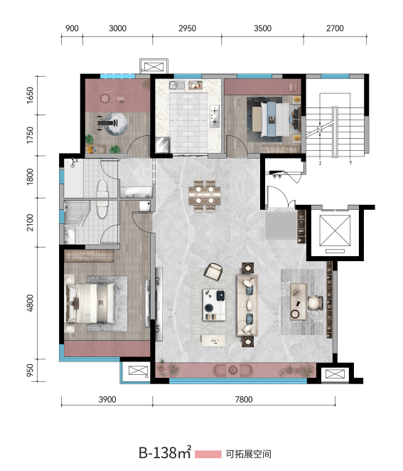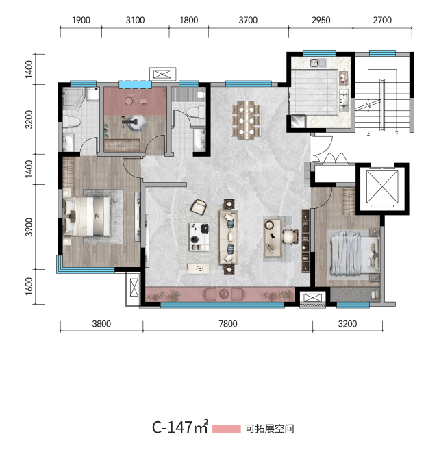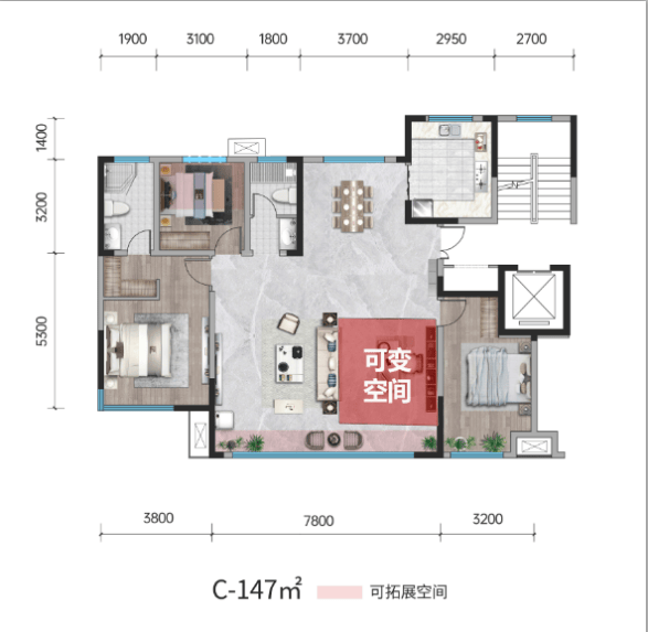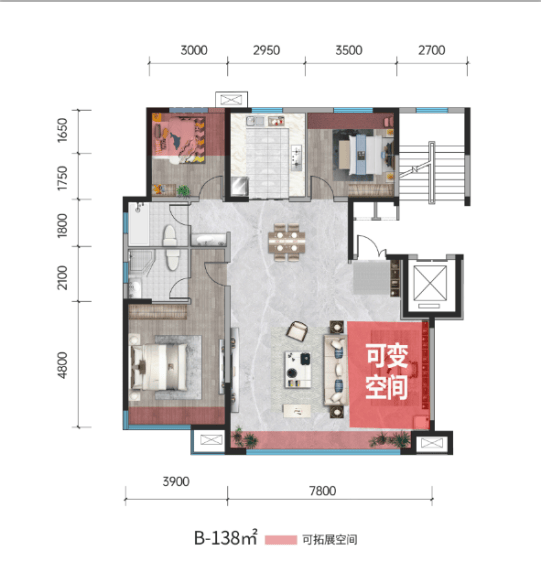除了上述所说的优秀户型之外,最为重要的一点建面约138㎡/147㎡户型可将可变空间部分改成一个南向次卧,随需要随心定制。