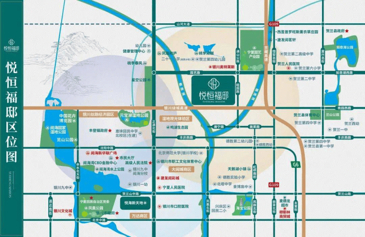 悦恒福邸位于园艺路与睦园路交会处,身居阅海北延伸区域与贺兰县发展交互板块,区位优势明显。