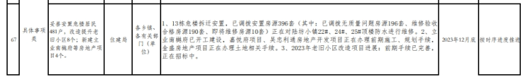 具体任务:妥善安置危楼居民481户,改造提升老旧小区8个;新建立业南樾府等房地产项目4个。