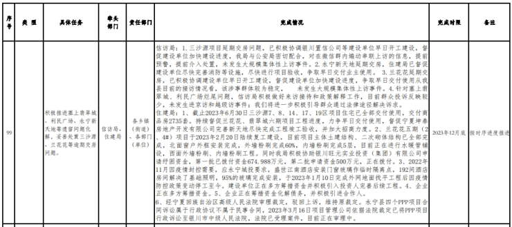 具体任务:积极推进塞上翡翠城、利民广场、永宁新天地等遗留问题化解,妥善处置三沙源,兰花花等逾期交房问题。
