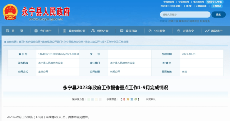 10月31日,永宁县发布2023年政府1-9月重点工作完成情况,共105项,主要分为指标类、专项行动类、示范创建类、具体事项类四大项,具体有各个产业完成情况,重大项目、生态、教育、医疗、交通、人才、企业建设等众多方面。