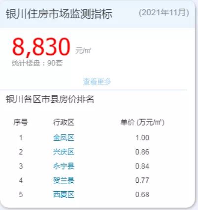 银川三区两县新房房价排名:金凤区10017(元/㎡)>兴庆区8616(元/㎡)>永宁县8425(元/㎡)>贺兰县7728(元/㎡)>西夏区6833(元/㎡)。
