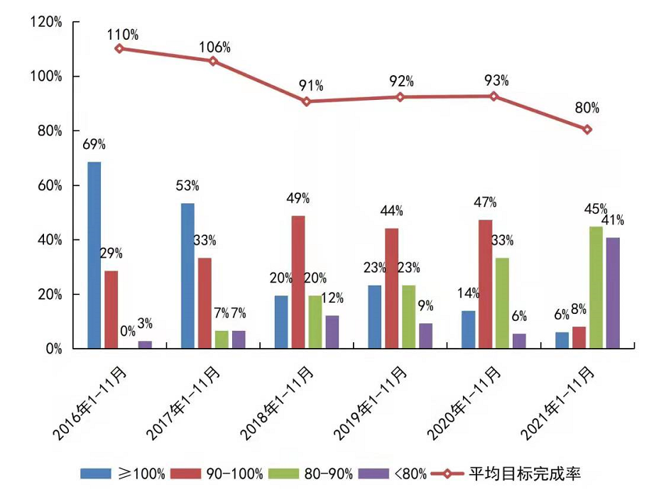 克而瑞数据显示,今年前11月规模房企平均目标完成率仅80.4%,明显低于近3年90%以上的平均水平。在年初披露年度业绩目标的部分规模房企中,截至11月末仅有14%的企业目标完成率在90%以上,远低于2018-2020年同期超60%占比。不过,前11月完成率在80%-90%的房企数量为45%,占比达到近6年来同期较高水平。