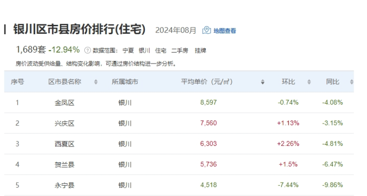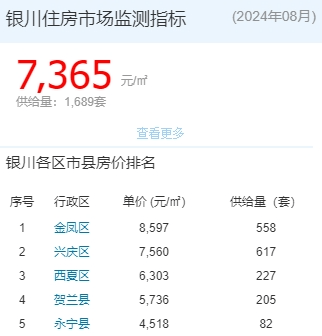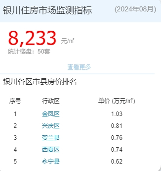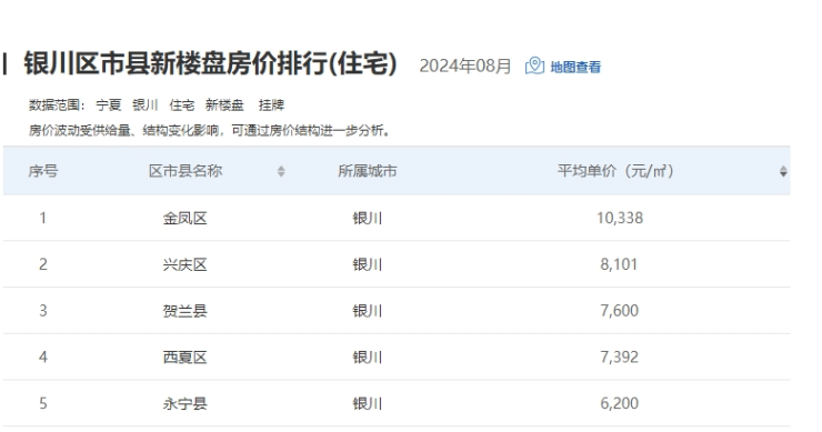 三区两县排名为:金凤区(10338元/㎡)>兴庆区(8101元/㎡)>贺兰县(7600元/㎡)>西夏区(7392/㎡)>永宁县(6200元/㎡)