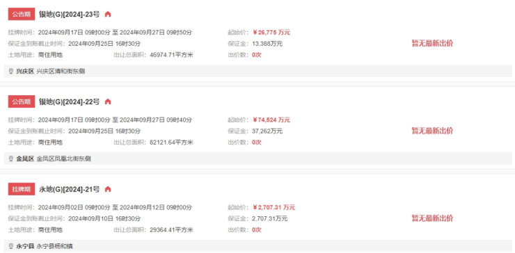 8月28日,银地(G)[2024]-22号、银地(G)[2024]-23号推出,将于9月27日挂牌截止。