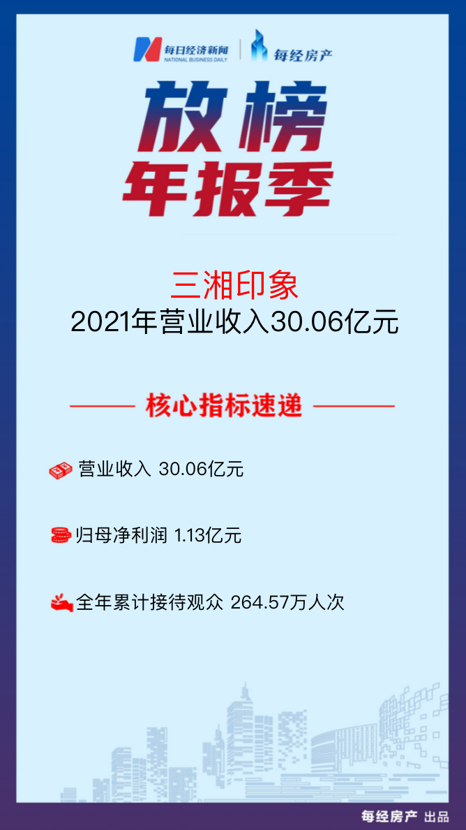 每日经济新闻2022-04-06 21:08:04 每经记者 包晶晶 每经编辑 陈梦妤 4月6日晚,三湘印象(000863.SZ)发布2021全年业绩。 2021年,三湘印象实现营业收入30.06亿元,归属于上市公司股东的净利润1.13亿元;旗下已公演项目2021年全年累计接待观众26