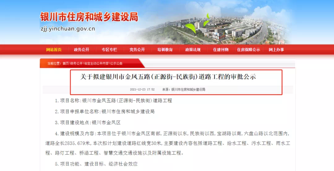 近日,银川市住房和城乡建设局公布了拟建金凤五路(正源街-民族街)道路工程的审批公示。